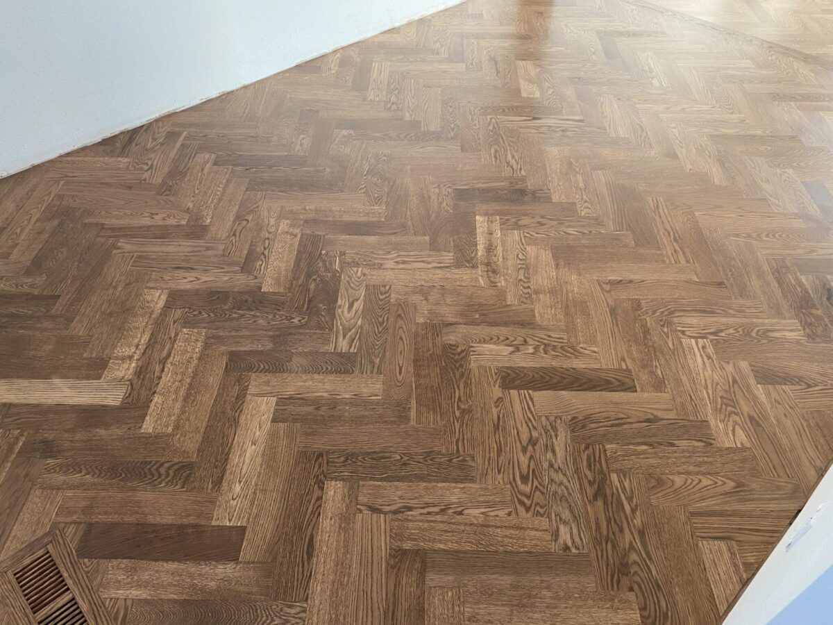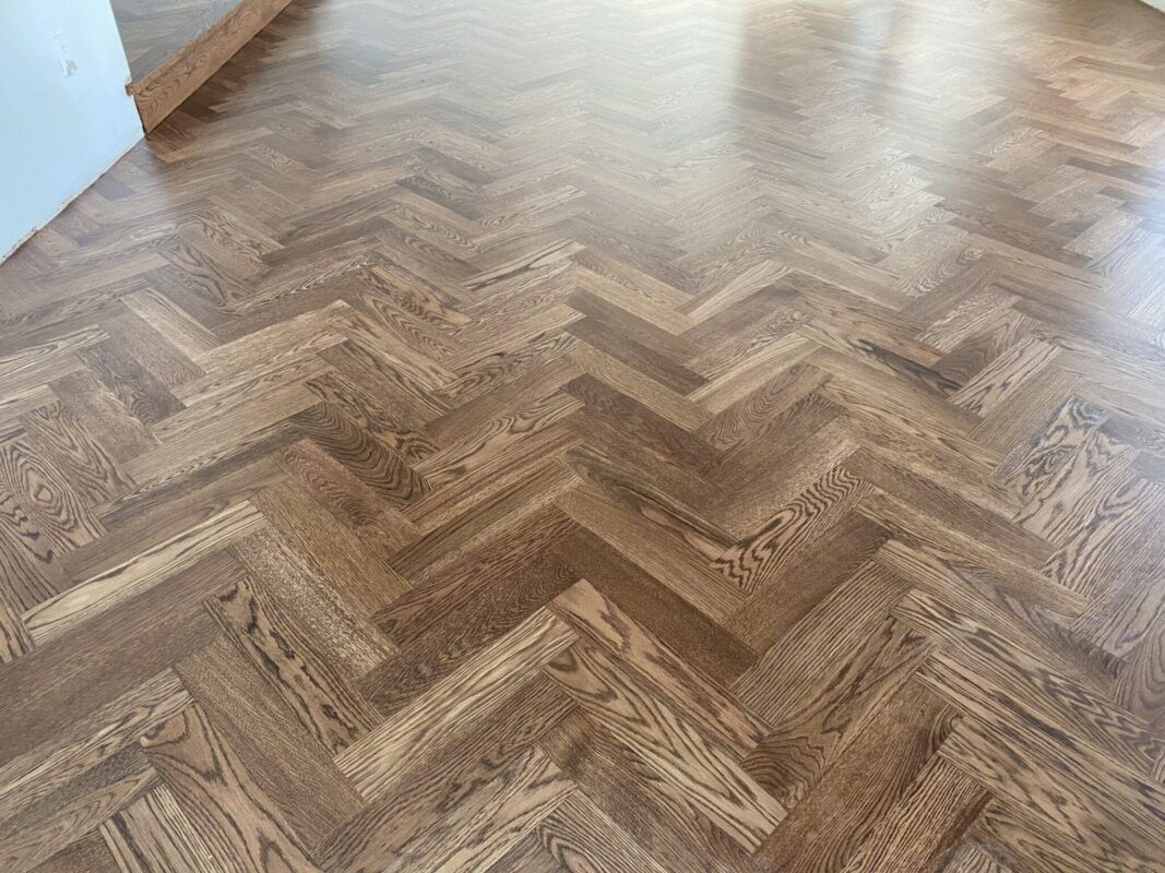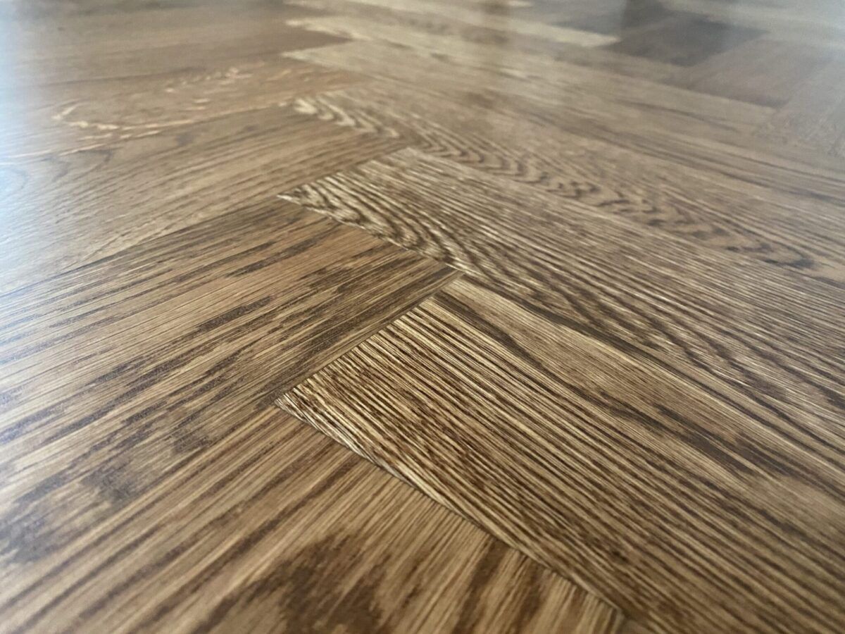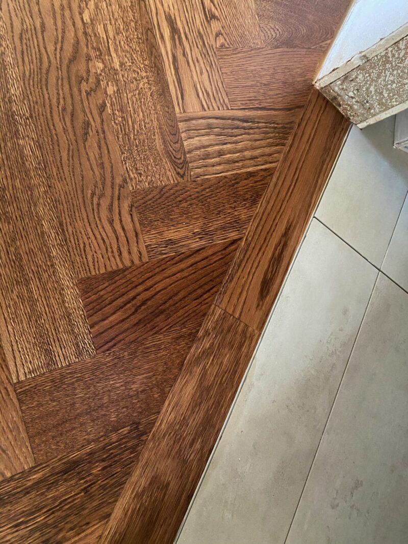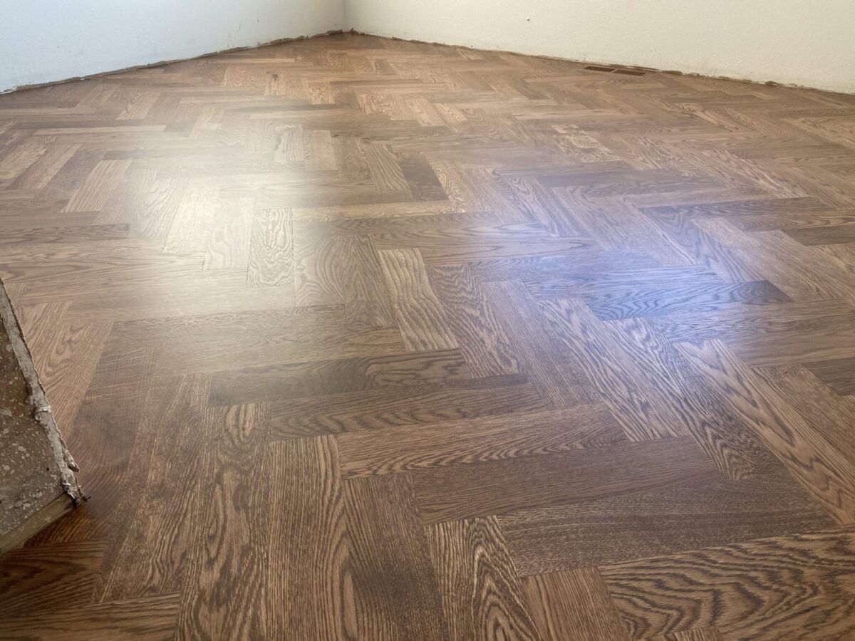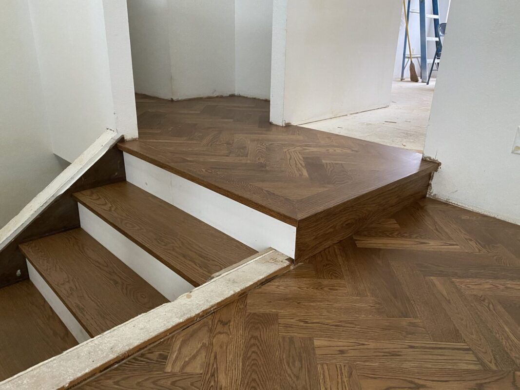 In this fully renovated 1,500 sq ft home, we installed 3.5″ x 14″ white oak engineered hardwood floors in a classic herringbone pattern — a design that blends timeless tradition with modern elegance. The wood was stained with DuraSeal Early American, offering warm mid-tones that highlight the natural grain and character of the oak.