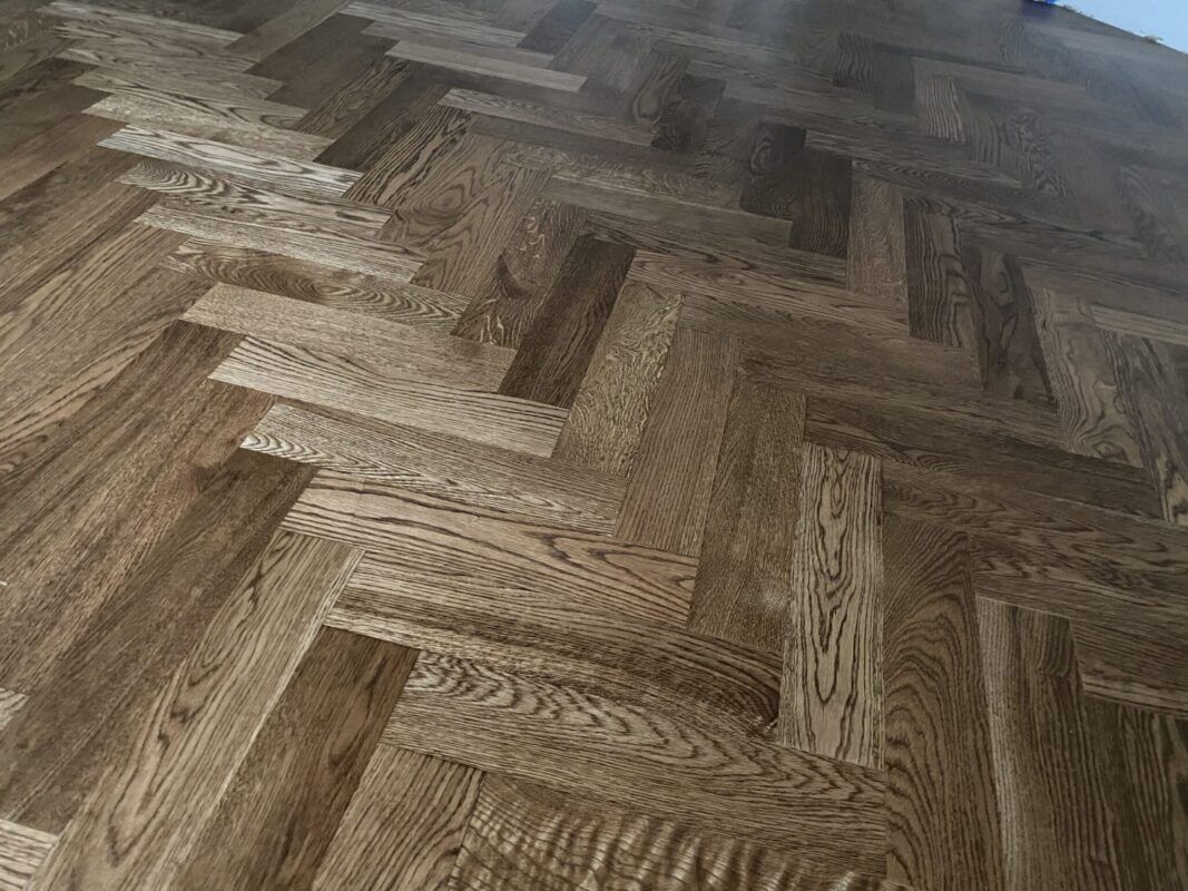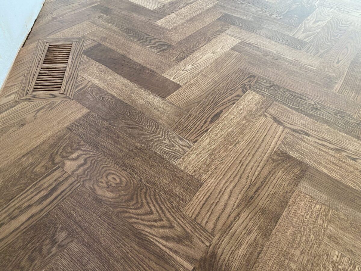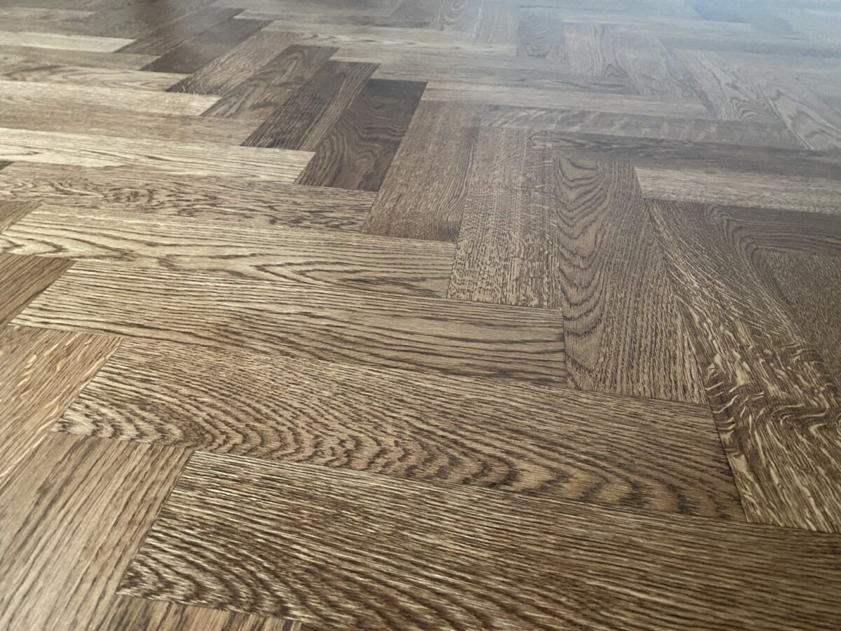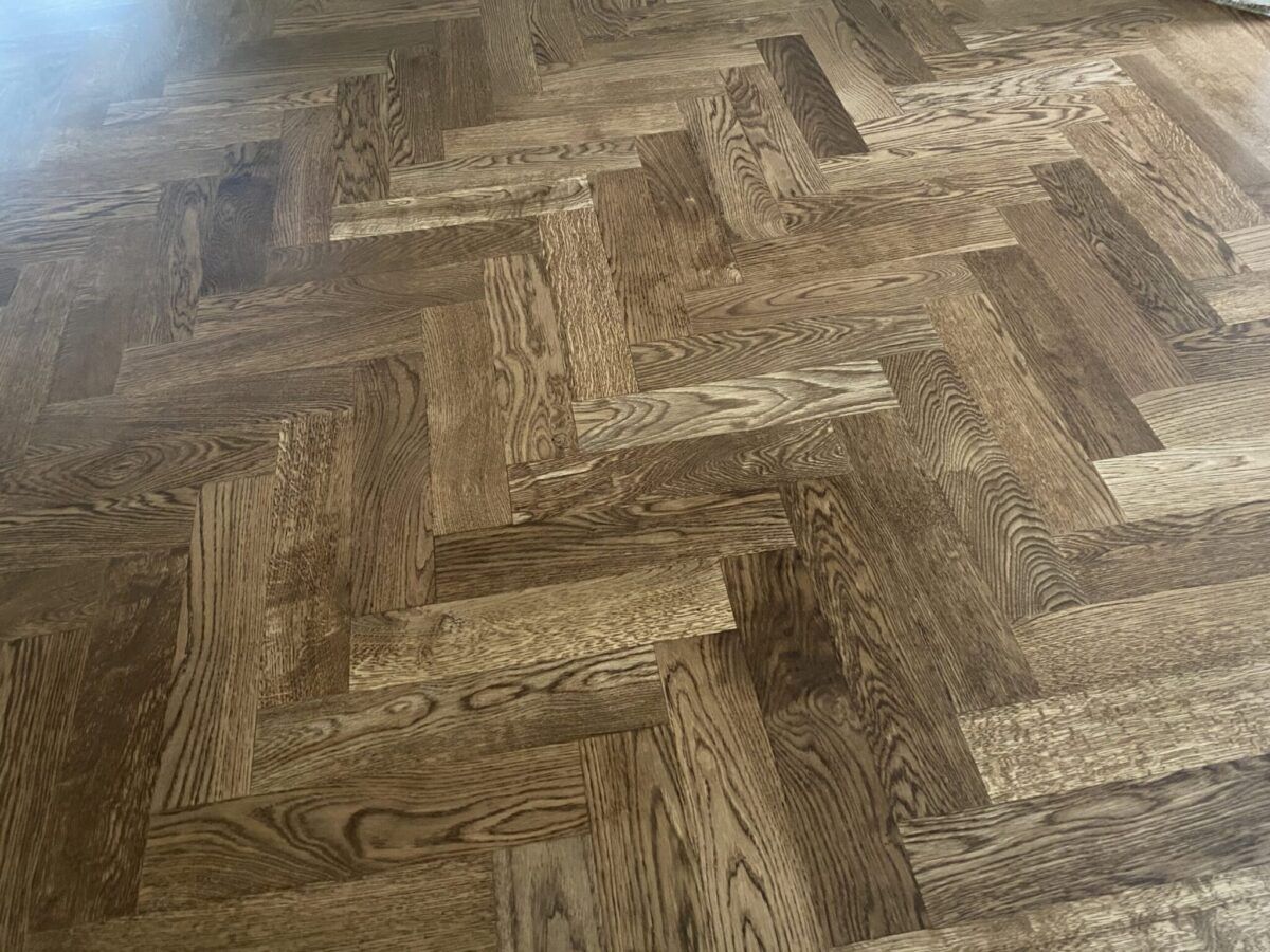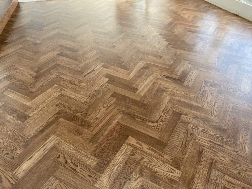 In this fully renovated 1,500 sq ft home, we installed 3.5″ x 14″ white oak engineered hardwood floors in a classic herringbone pattern — a design that blends timeless tradition with modern elegance. The wood was stained with DuraSeal Early American, offering warm mid-tones that highlight the natural grain and character of the oak.