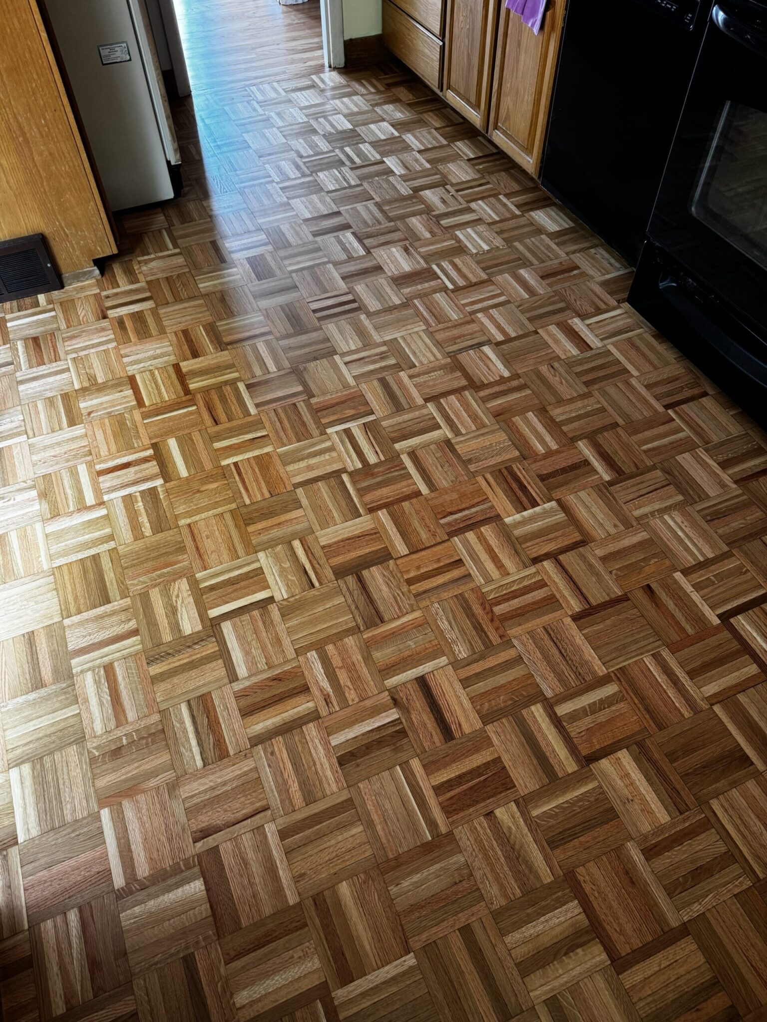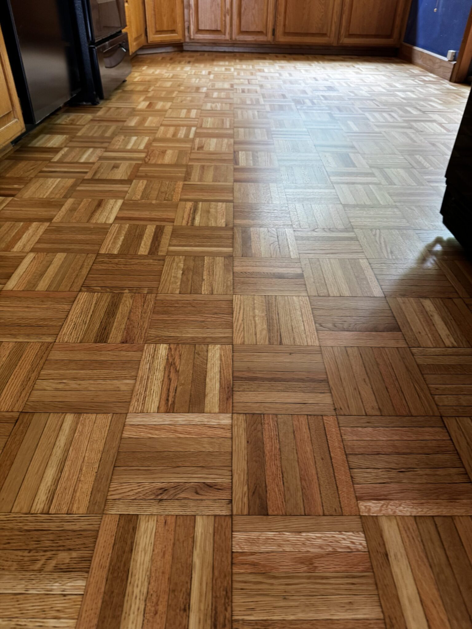 The result? A clean, modern floor with timeless warmth—reviving the original charm of the hardwood and adding a sophisticated depth to the kitchen parquet.