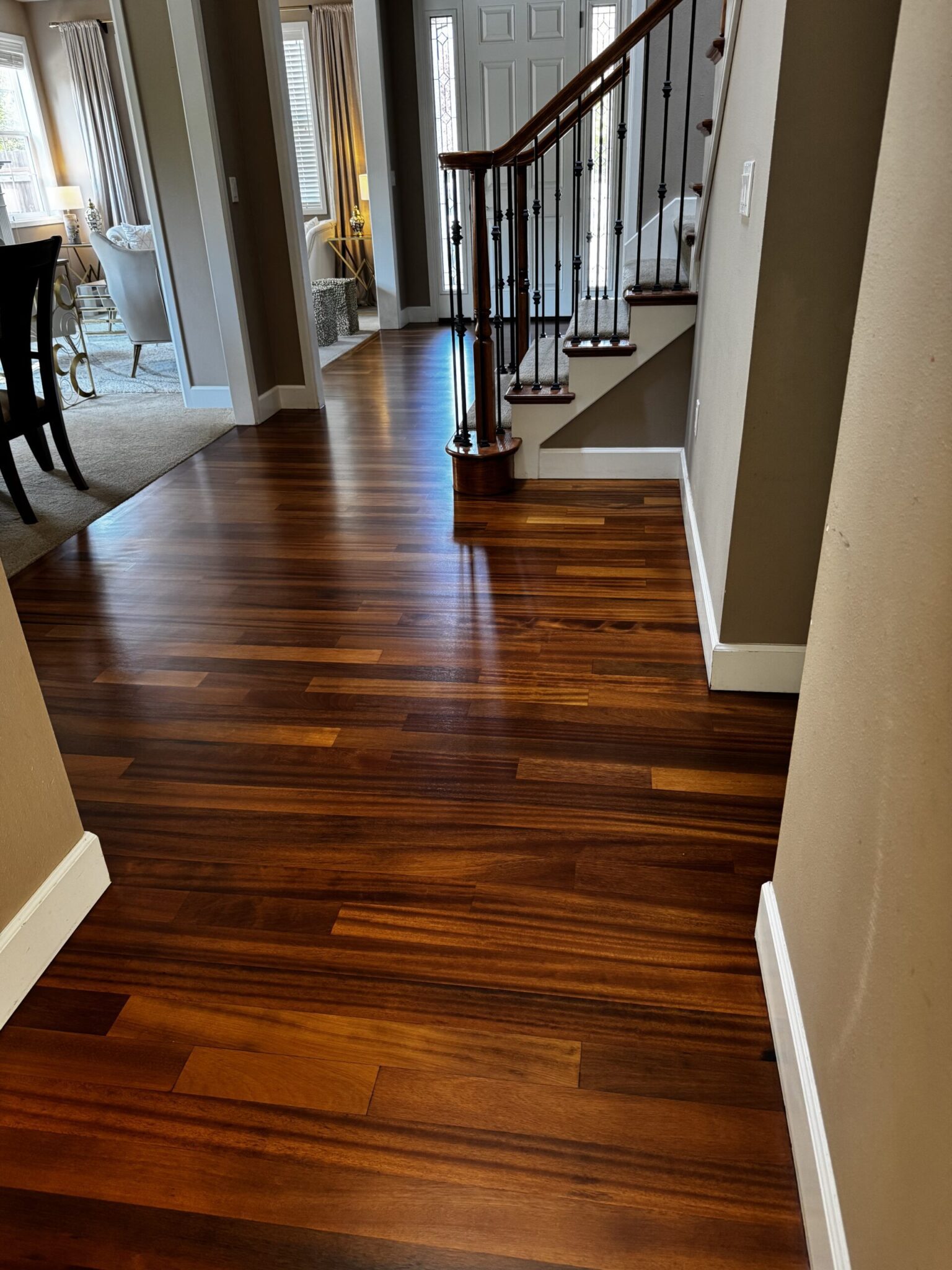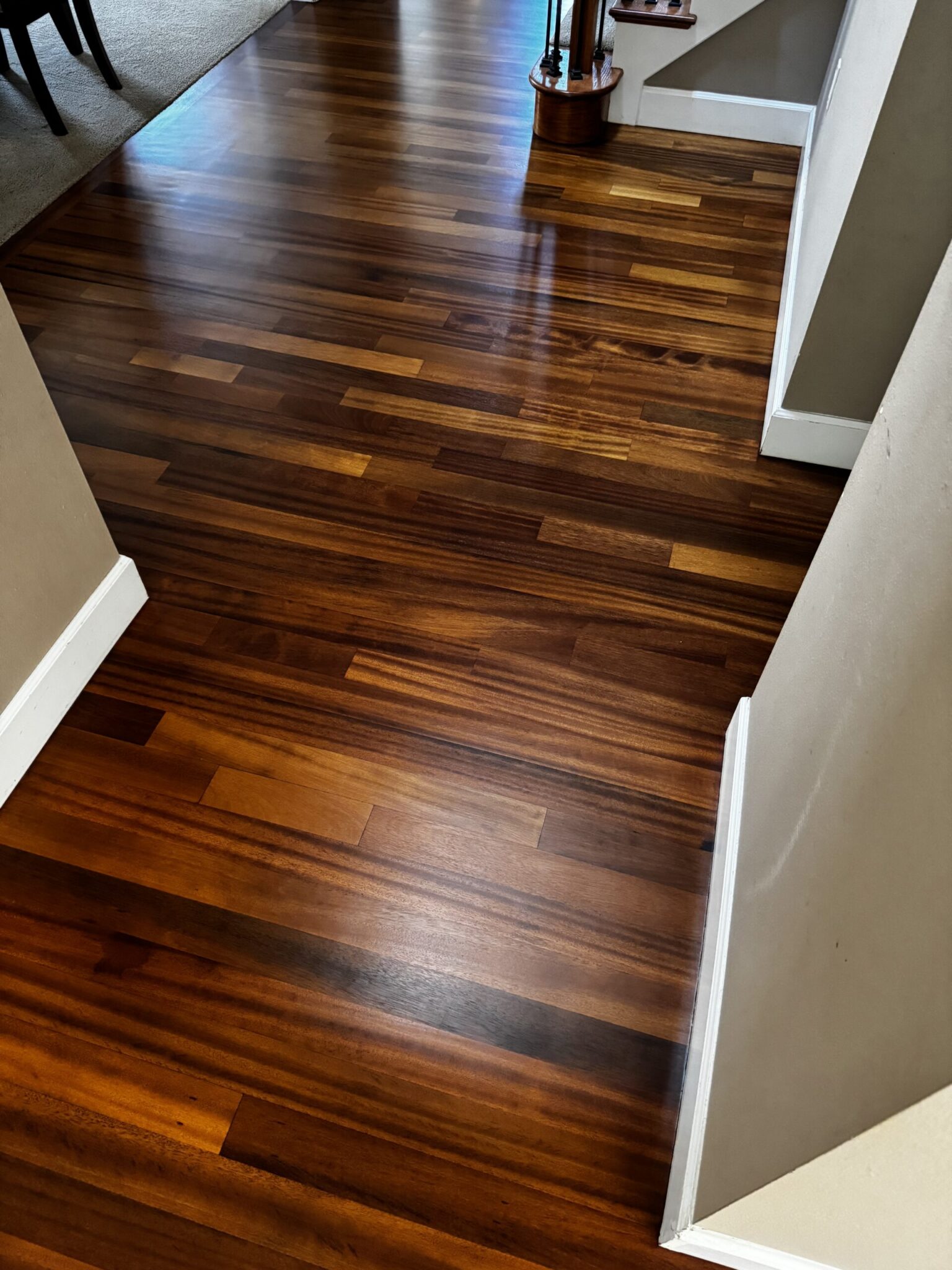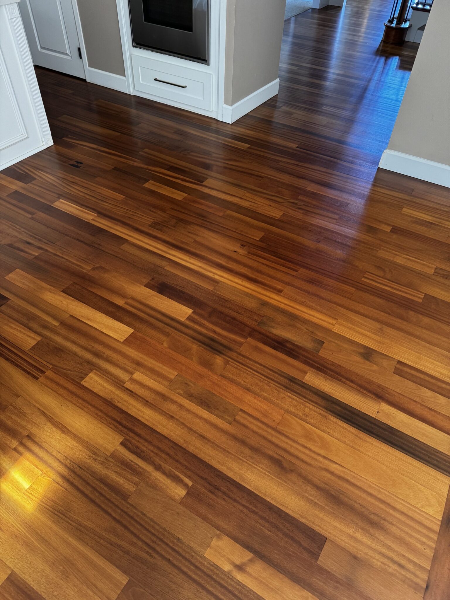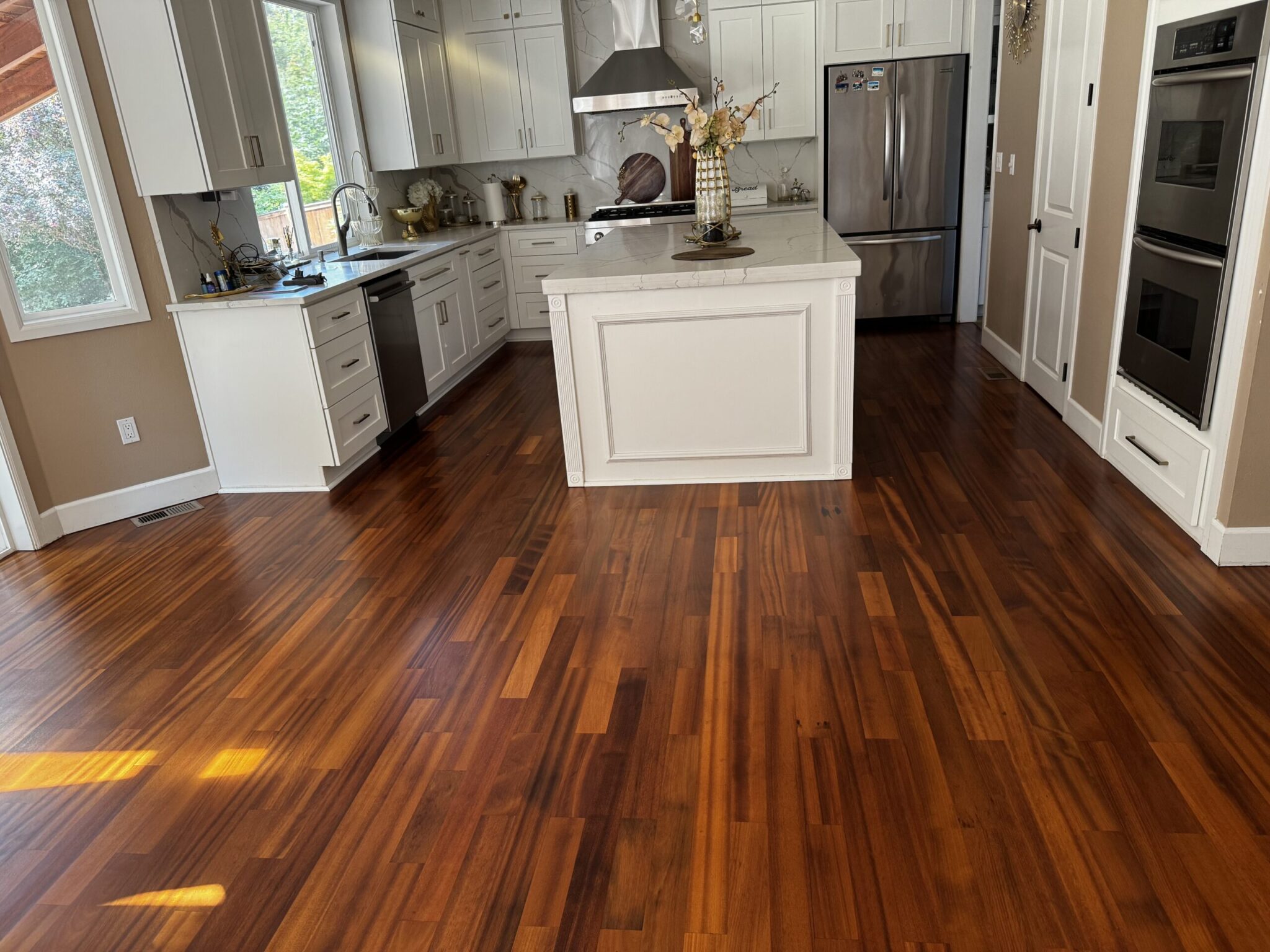In a tranquil Redmond residence, the homeowners entrusted us with a rare gem — Tatajuba hardwood floors, rich in golden hues and character. Our mission: restore its original beauty without compromising its exotic charm.