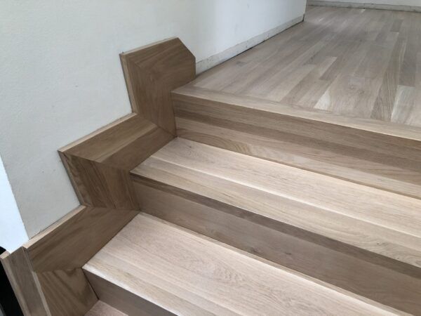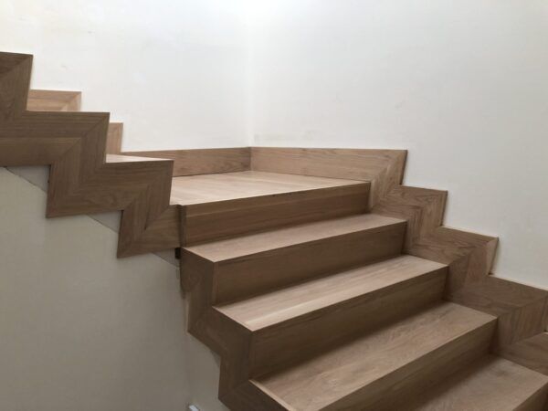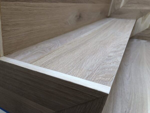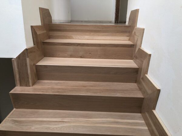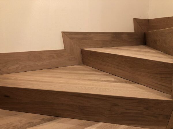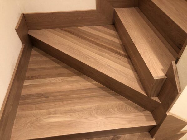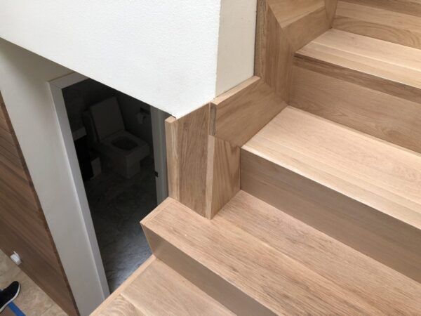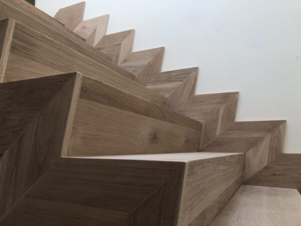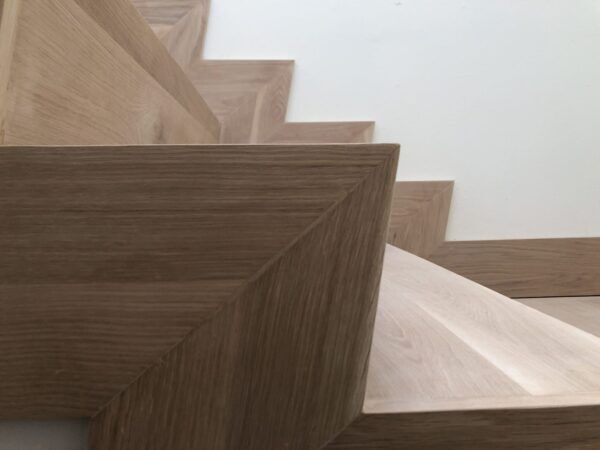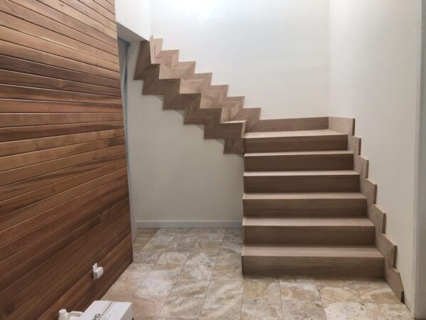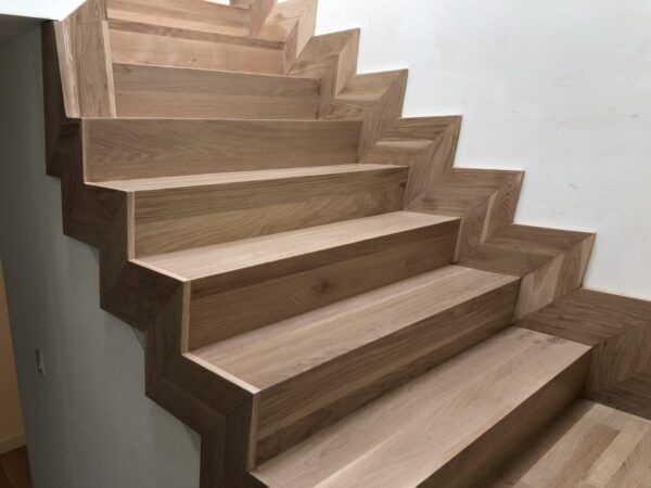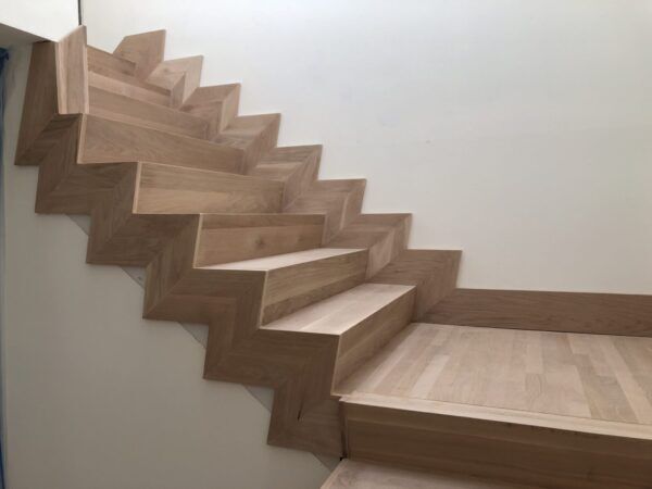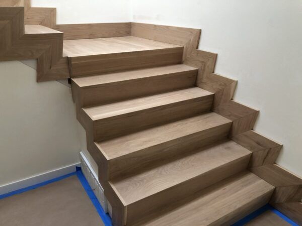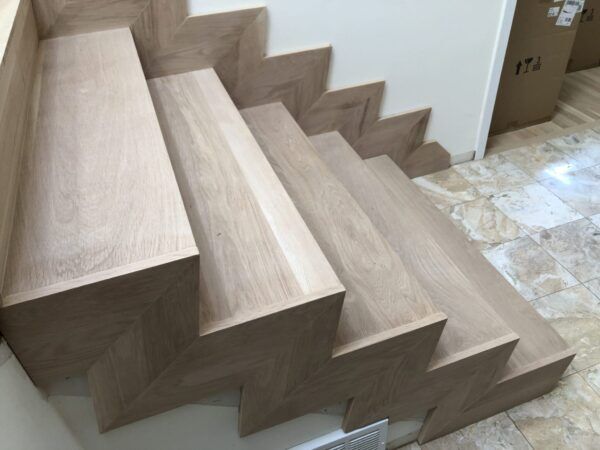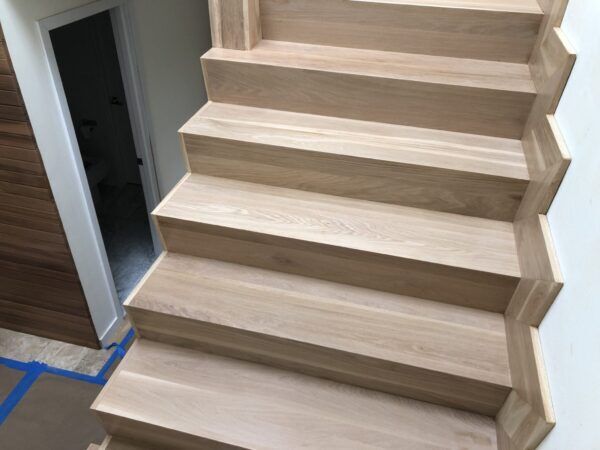 We used premium white oak select hardwood for the treads and risers, installed at an 80-degree angle to meet modern building codes while delivering a distinctive architectural look. To enhance the design, matching white oak panels were applied to both the open stair side and the adjacent wall, visually expanding the stairwell and creating a seamless, wide-plank effect.