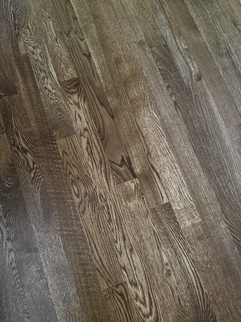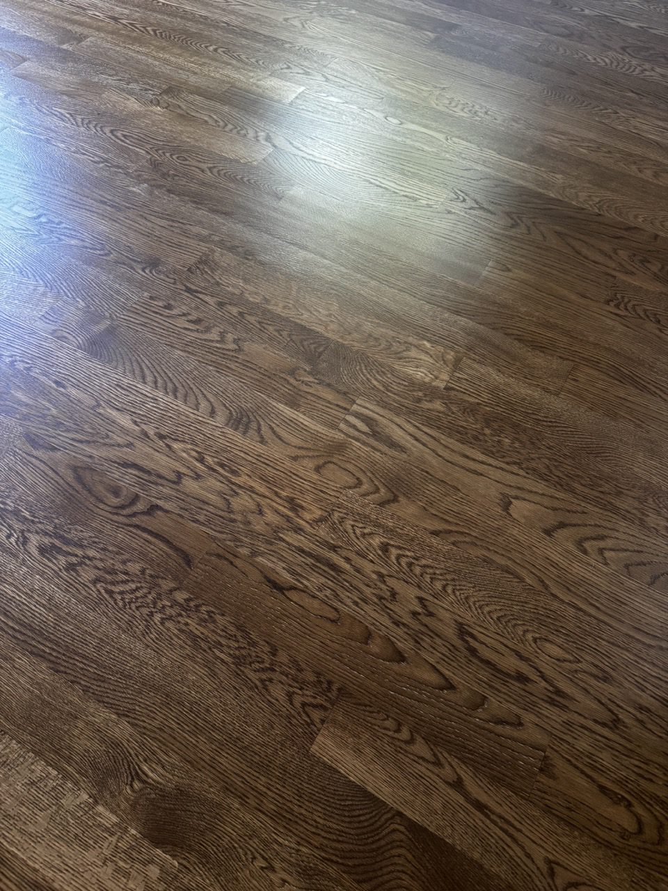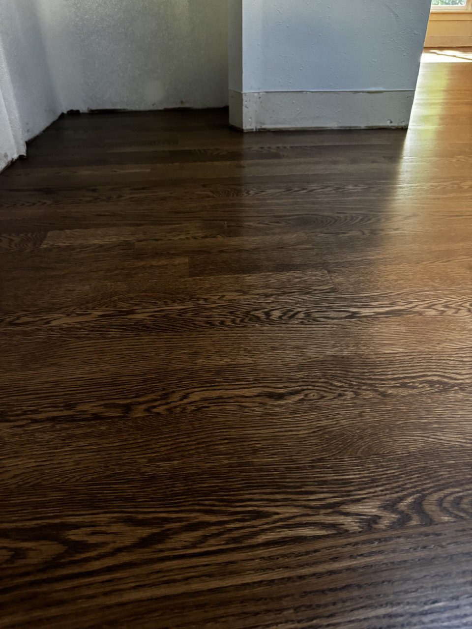 3.25” white oak hardwood floors, stained in DuraSeal Special Walnut, and protected with a